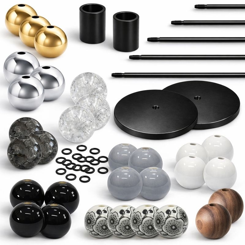 Startsæt til byg selv lysestager med kugler. Delene bruges til at samle 2 lysestager med kugler, hvor du kan skifte farver og højde ved at flytte kugler og vælge stanglængde.